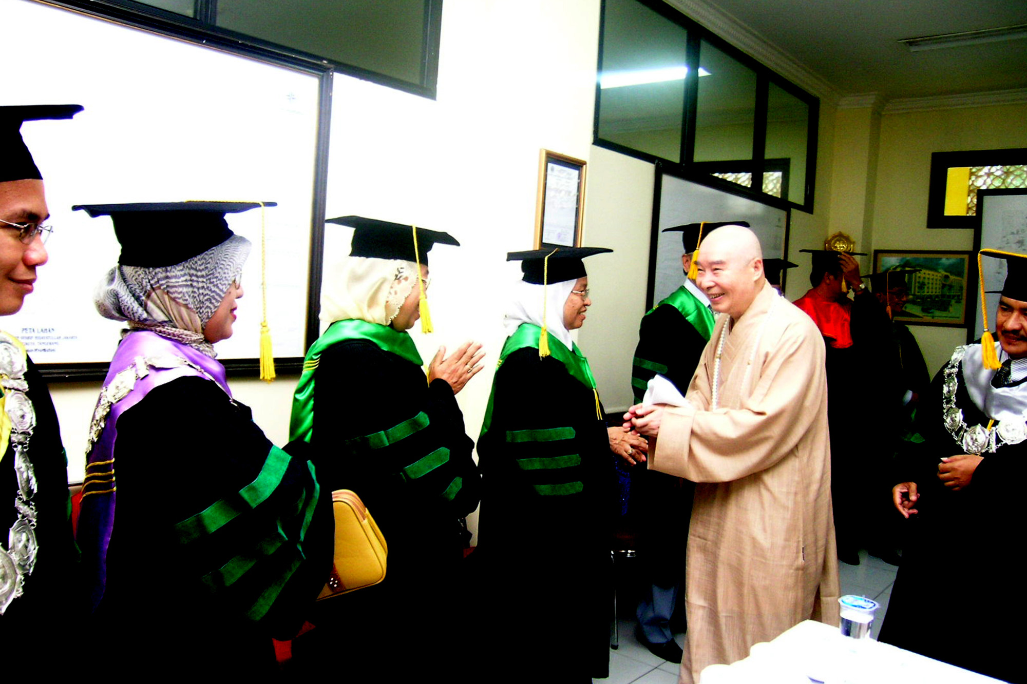 一九四九年旅居臺灣。一九五三年,求學於哲學大家方東美教授,得聞「釋迦牟尼佛是最偉大哲學家、佛教是哲學最高峰、學佛是人生最高享受」,因而進入佛門。同年,追隨內蒙藏傳佛教高僧章嘉大師,學習看破放下,力行三種布施,改造自身命運。一九五八年,親近儒佛大家李炳南居士,堅守約法三章,十年隨師教誨,奠定師承基礎。